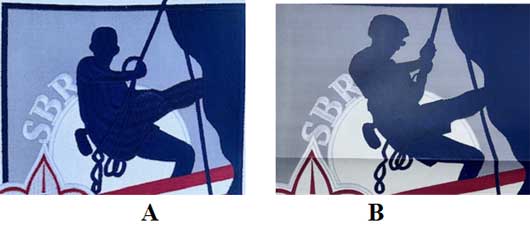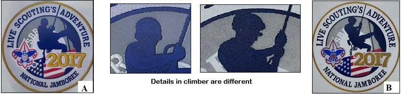 | (Below) - There are two varieties of the 7 1/2” backpatch. My source didn’t know anything about them. Type A is the common variety with a Blue Figure of the climber and Front view of the face (2 ears). Type B to the right features a Black figure of the climber and Side view of the face. |